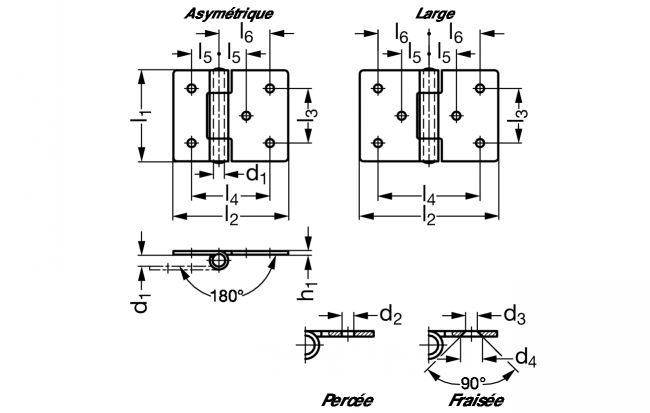 Charnière asymétrique ou large, noeud à plat, inox 316