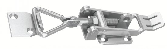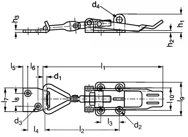 - 36-83 grenouillère à crochet réglable, acier ou inox, avec trou pour cadenas et une distance de serrage l1 variant de 82 à 129 mm.
