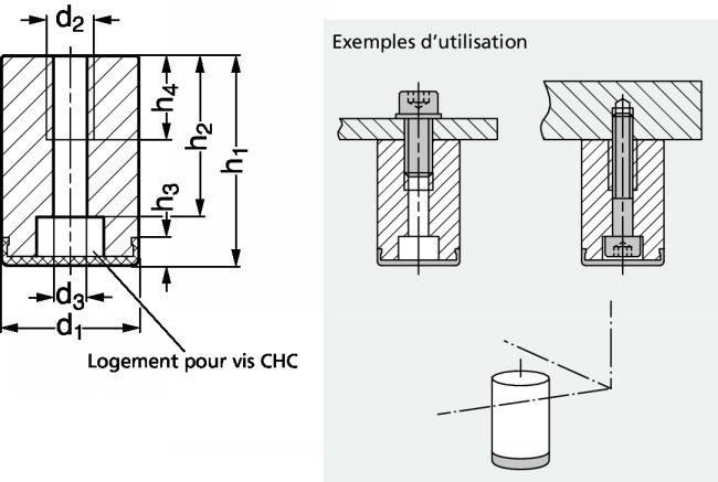 - Ces pieds peuvent être montés par le haut grâce au taraudage de diamètre d2 ou par le bas grâce à l'alésage et au lamage qui sont prévus pour une vis CHC de diamètre d3.