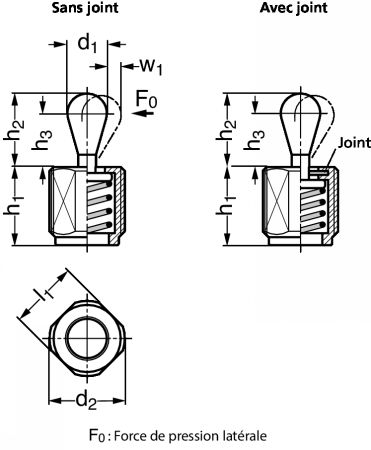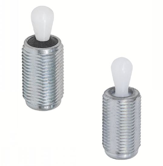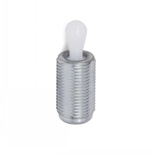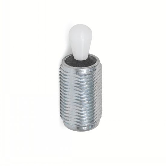 - Ce poussoir à pression latérale fileté, disponible avec ou sans joint, possède une tête en plastique qui préserve les surfaces maintenues en contact.