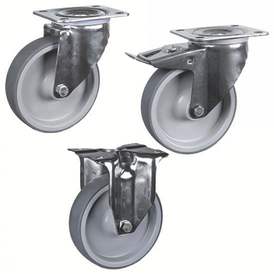 - Cette roulette charge moyenne est disponible en version pivotante sans frein, pivotante avec frein et en version fixe sans frein.
