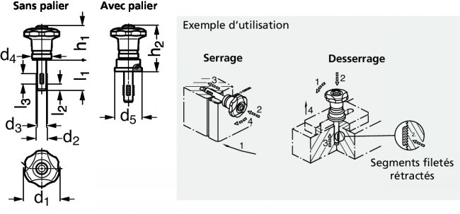 - Lorsqu'on relâche le bouton poussoir, le ressort se détend, les segments filetés s'engagent dans le taraudage et permettent d'effectuer un serrage et un desserage rapide en moins d'un tour.