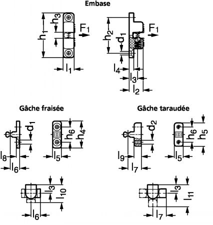 - Il existe deux types de gâches avec des trous fraisés ou taraudés qui peuvent s'insérer en position latérale ou de face dans l'embase du loqueteau.