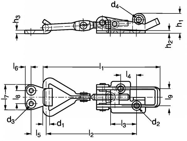 - 36-81 grenouillère à crochet réglable, acier ou inox, avec une distance de serrage l1 variant de 82 à 121 mm.